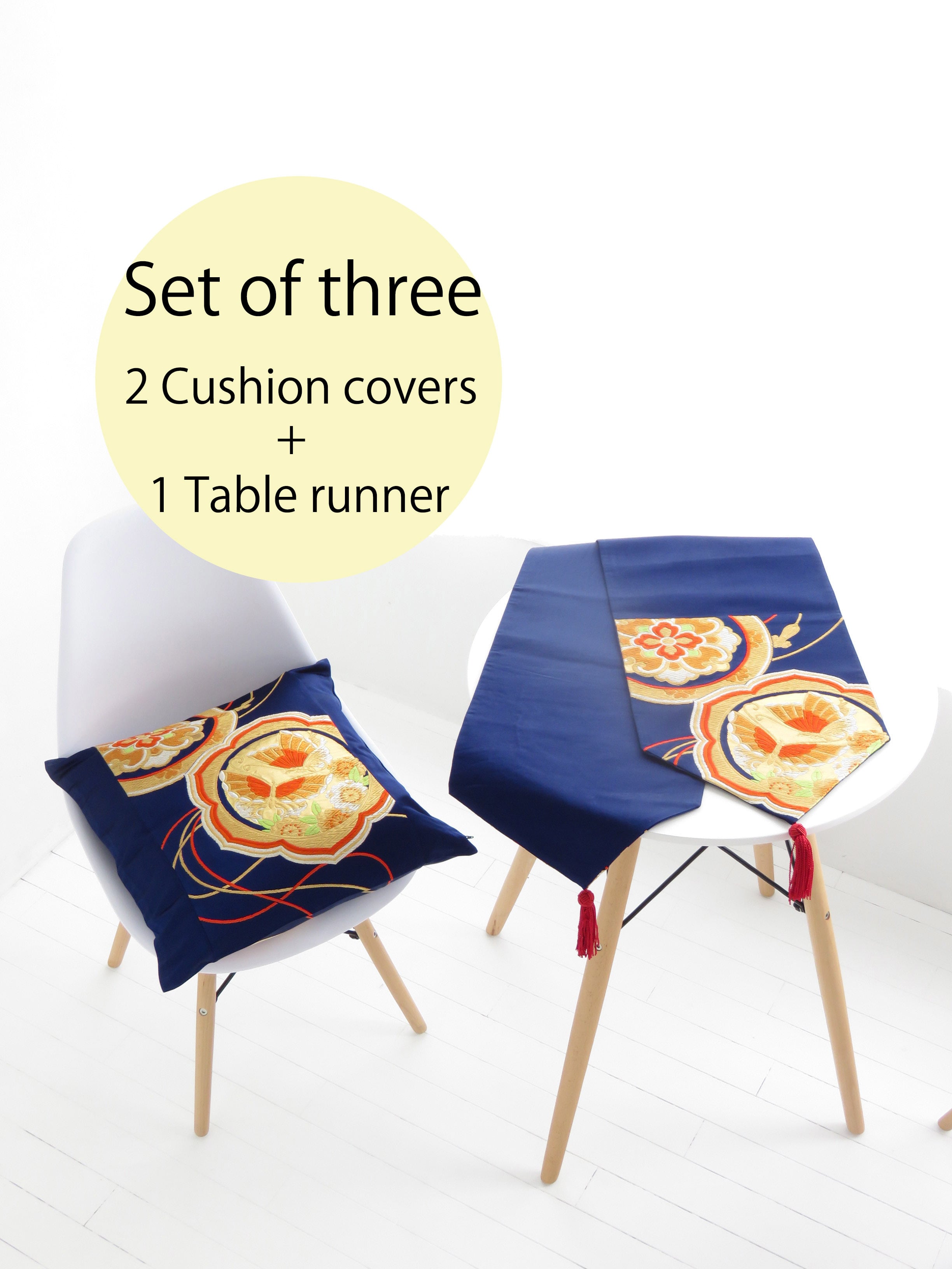着物帯をリバース(再生)した、ジッパー付きクッションカバー2点+テーブルランナー1点の計3点セット