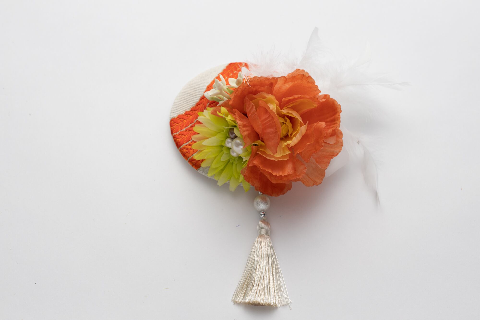 ・素材:着物帯、ピック、造花、飾り紐、コーム